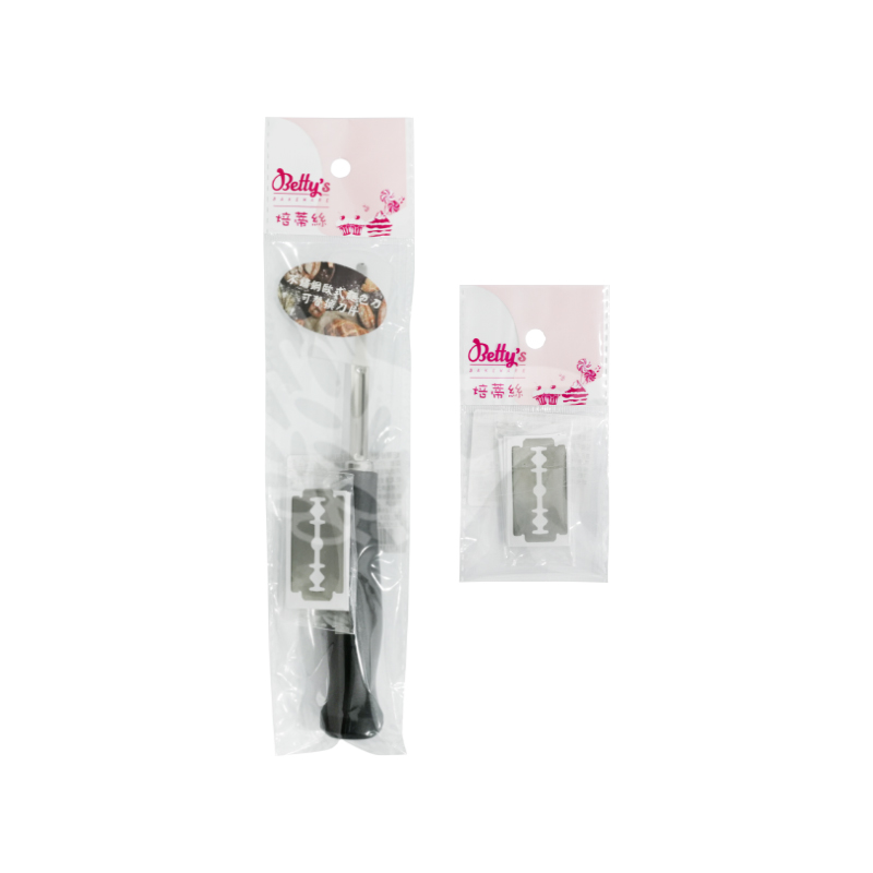 FT1324 用途:麵包劃線工具 內容物:手柄*1、刀片*5、收納蓋子*1 歐式麵包整形刀,可幫麵包刻劃出美美的花紋造型。 FT1324-1 用途:麵包劃線工具 搭配FT1324的替換刀片。 更換刀片操作說明可掃描包裝Qrcode查看教學影片。