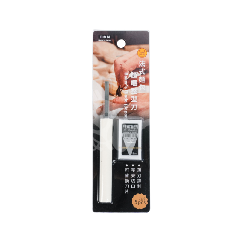 尺寸:總長160x刃長50mm;刀片43x22mm 內容物:刀柄x1、雙刃刀片x5 適用於歐式麵包上花紋雕刻,薄刃鋒利、完美切口,可替換刀片。