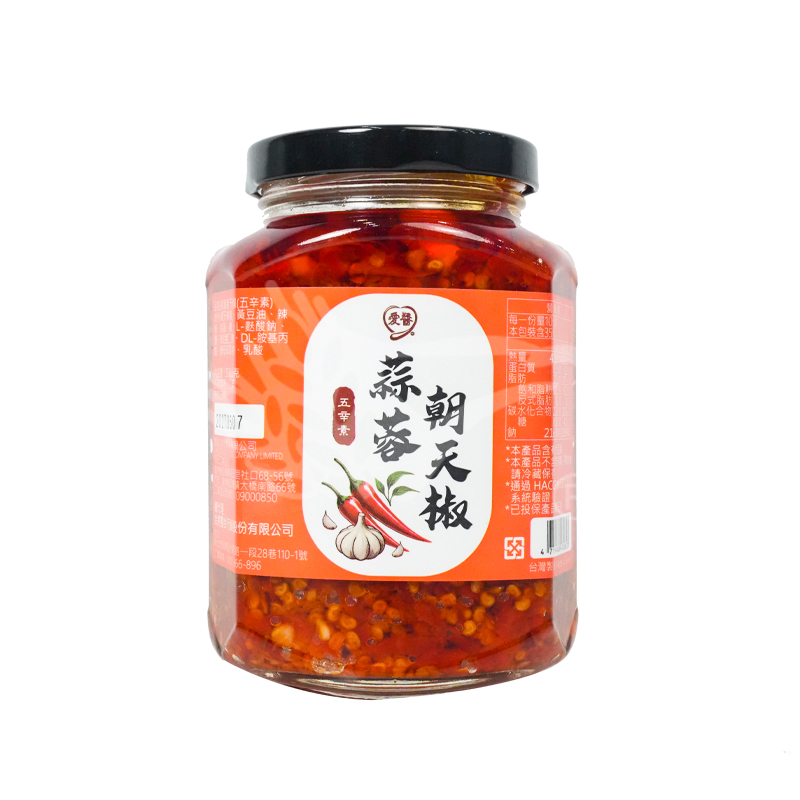 ※此商品屬於玻璃易碎品,配送過程破損風險高, 為確保商品安全,一律以黑貓配送,因運費計算不同, 下單後請務必加入客服詢問另補差額運費事宜。 全素。 精選台灣在地朝天辣椒與新鮮蒜蓉,以獨家古法釀製而成,香氣濃郁,辣勁十足。
