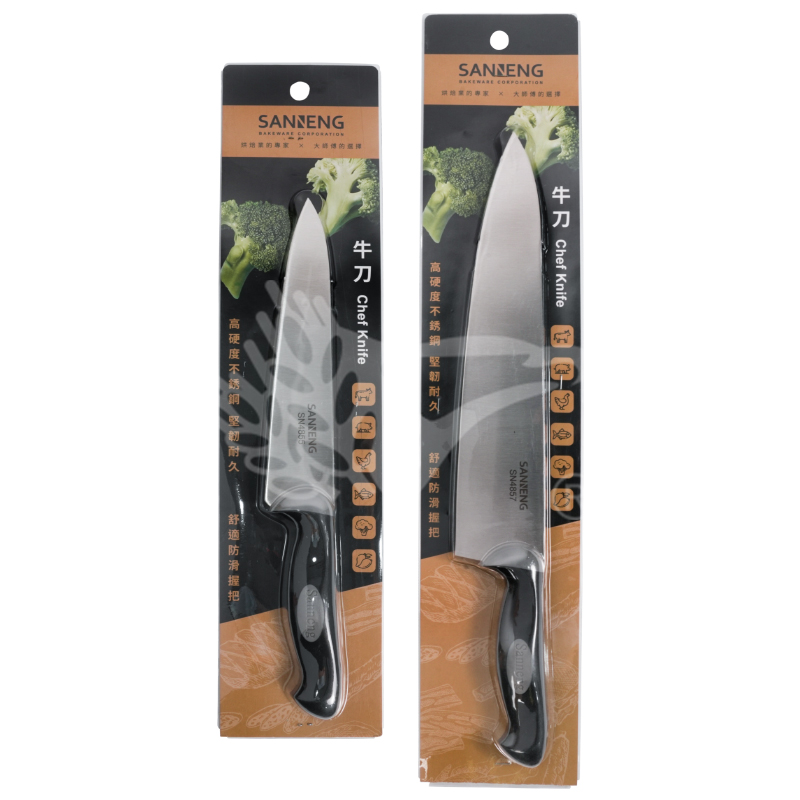 SN4855尺寸:總長320x刃長190mm SN4857尺寸:總長401x刃長270mm 耐熱:-20~80℃ 刀身材質為420不鏽鋼,高硬度堅韌耐久, 雙色流線型握把,符合人體工學、舒適防滑。