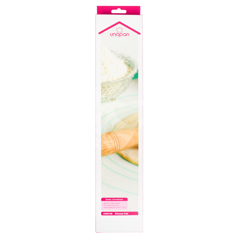 將麵團按照矽膠墊上的刻度尺寸擀開,即可用於相對大小之派盤、烤盤。